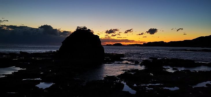 Am Morgen gibt’s Frühstück auf Japanisch. Wir dürfen den Kaffee nicht selbst machen am Automaten, es steht eine Hilfe für einfach alles zur Verfügung. Und meist ist man selbst nicht schnell genug. Da sind so vile helfende Hände rundherum, das überfordert uns ein wenig. Die Japaner sind sowas von freundlich; das ist man sich nicht so gewohnt. Im Anschluss an das Frühstück fahren wir zum Ritsurin Park. Es bläst uns ein kalter Wind um die Ohren, wir entscheiden uns, den Park bei diesem Wind und dem winterlichen Kleid nicht anzuschauen. Wir fahren weiter nach Tokushima zum Hafen, um 10.55 Uhr fährt die Fähre nach Wakayama. Die Fähre fährt uns vor der Nase ab und wir müssen 2 Stunden warten. So schauen wir für ein Picknick Mittagessen und tanken unseren Fred. Danach um ein Uhr können wir an Bord der Fähre und um 13.20 Uhr fährt diese dann endlich los. Die Überfahrt dauert etwas mehr als 2 Stunden. Bei der Abfahrt in Tokushima schneit es. In Wakayama ist das Wetter dann wieder gut. Wir fahren der Küste entlang nach Kushimoto. Die Fahrt entlang der Küste ist wunderschön. Leider ist es bereits um 6 Uhr dunkel, nichtsdestotrotz sehen wir wunderschöne Buchten in rotes Licht gehüllt. Abends um 18.00 Uhr sind wir dann in Shingu, wo wir für die Nacht bleiben.