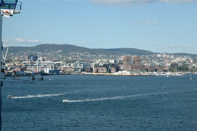 Wetter: vormittags bewölkt mit stürmischem Seegang; nachmittag wunderschön Früh gibt's Frühstück, danach fahren wir zum Hafen, um unser Wohnmobil und uns auf der Fähre "Festival" von der Colorline zu verschiffen. Nach 09.00 Uhr geht die Fahrt bei stürmischer See los. Bald stellt sich heraus, wer von unserer Familie seekrank ist. Die Kinder sind's nicht. Gegen Mittag beruhigt sich dann die See, das Wetter ist wunderschön. Am späten Nachmittag fahren wir bei wunderschönem Wetter in den Oslo Fjord ein. Phantastisch ist die Fahrt durch den Fjord bis Oslo. Wir laufen abends um 06.00 Uhr im Hafen von Oslo ein und sind schnell einmal wieder auf Rädern in der Stadt. Wir entscheiden uns, hinauf zur Holmenkollenschanze zu fahren um einen Überblick über die Stadt zu erhalten. Schnell ist die Schanze gefunden, ist ja auch nicht zu übersehen. Mit dem Lift und zu Fuss geht's hinauf zum Absprungspodest. Von hier aus hat man eine wunderschöne Sicht über ganz Oslo und Umgebung. Wir übernachten in der Nähe der Schanze auf einem Parkplatz.